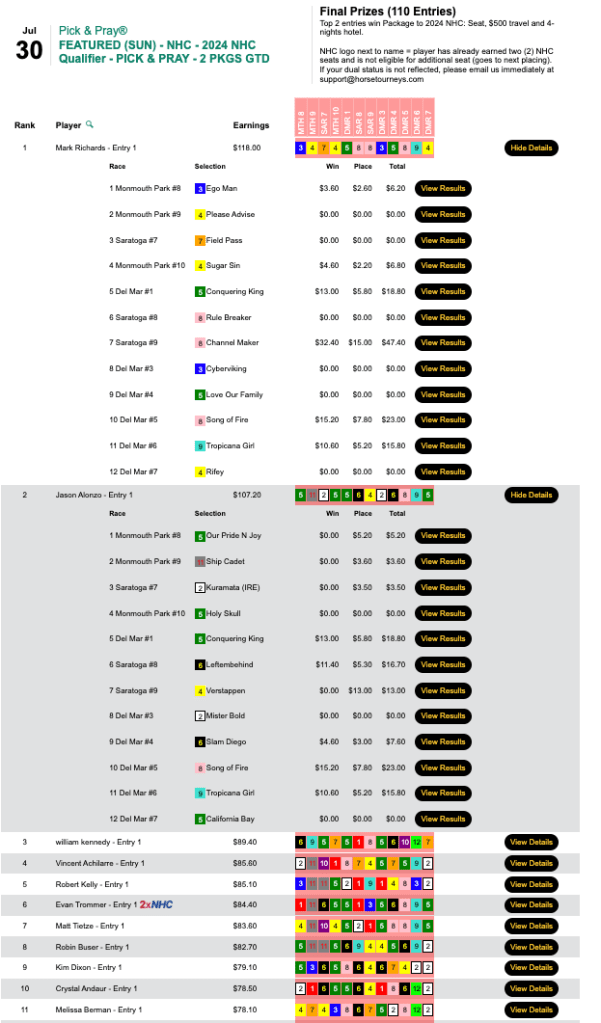 The Sunday NHC qualifier took place here at HorseTourneys, and Mark Richards (6 wins, 0 places) and Jason Alonzo (5W, 4P) came out on top.
