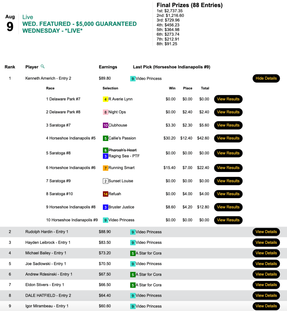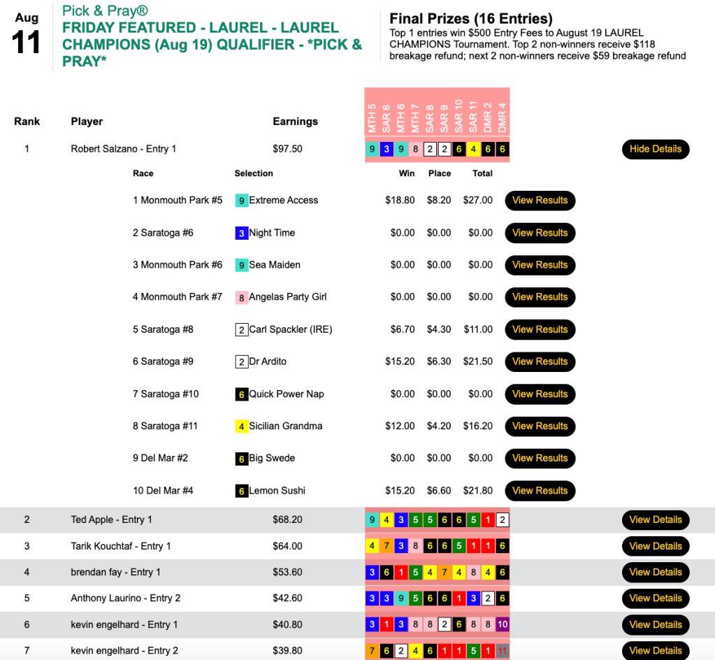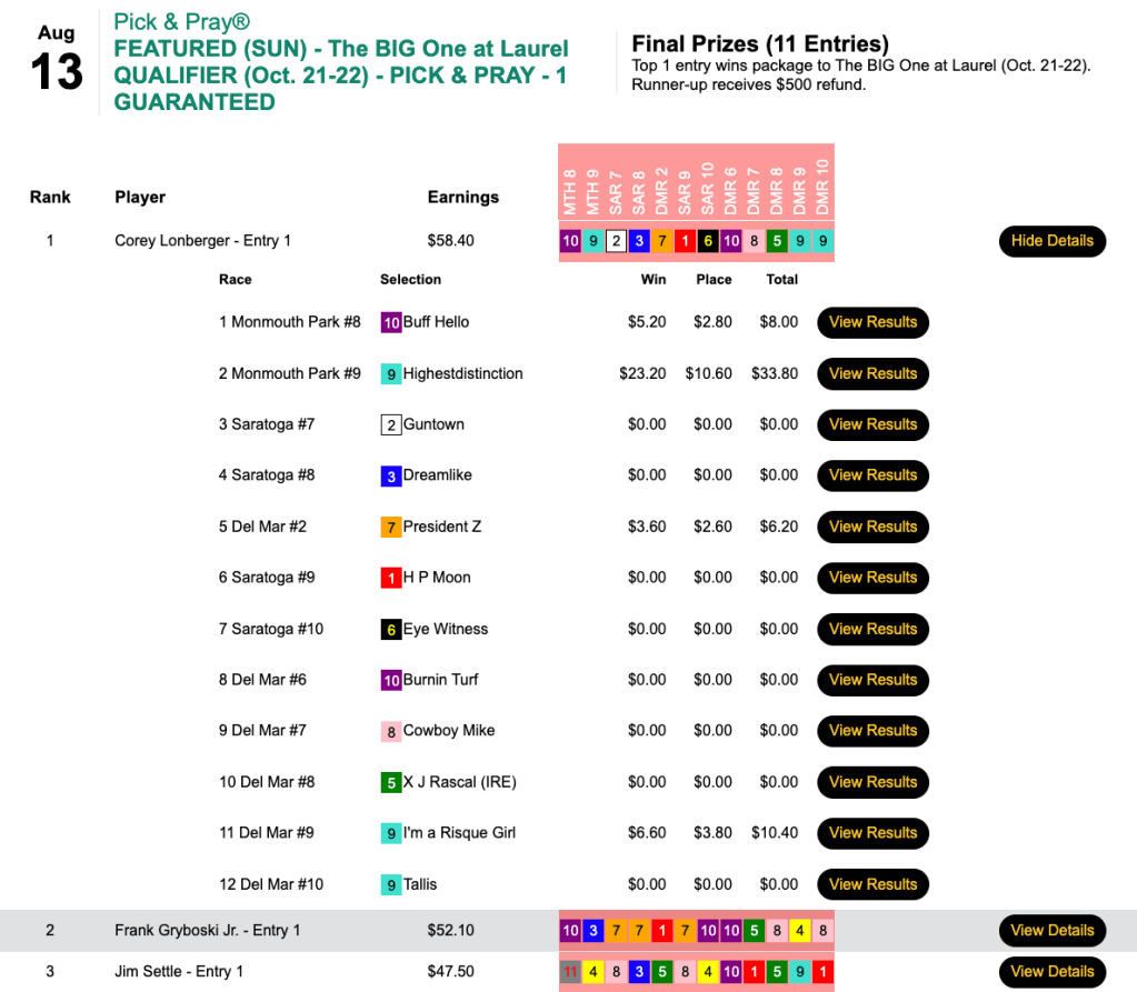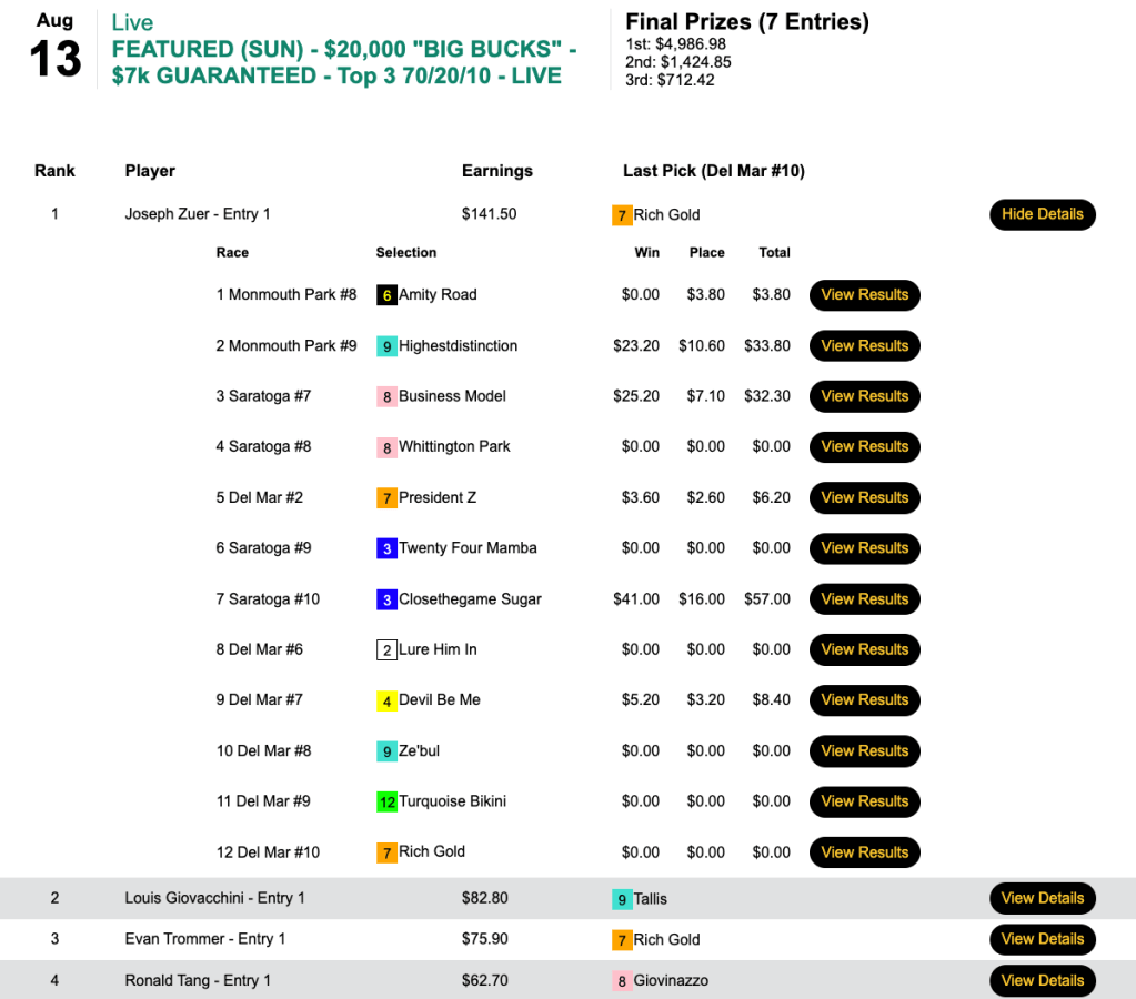 Zuer’s bank account (or at least his HorseTourneys account) grew further after our $7,000 Guaranteed Big Bucks game.