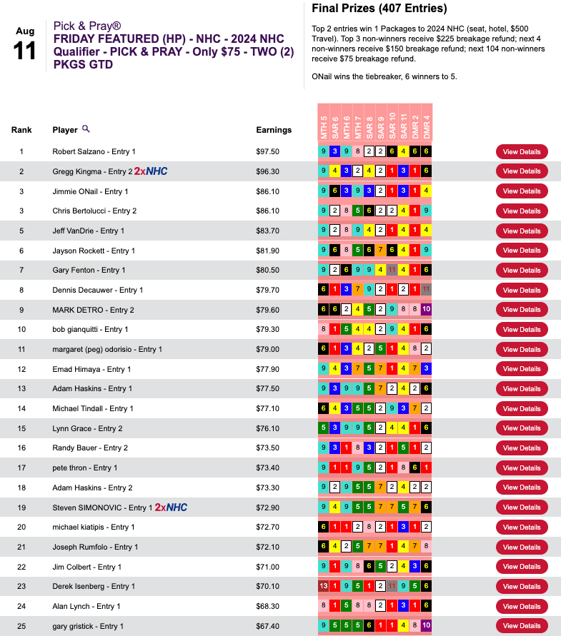 Friday’s NHC play-in at HorsePlayers was the always-popular $75 buy-in game.