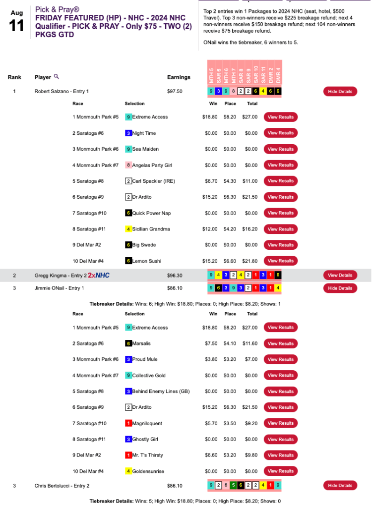 There was also a $500 Low Ratio NHC qualifier on Saturday over at HorsePlayers.