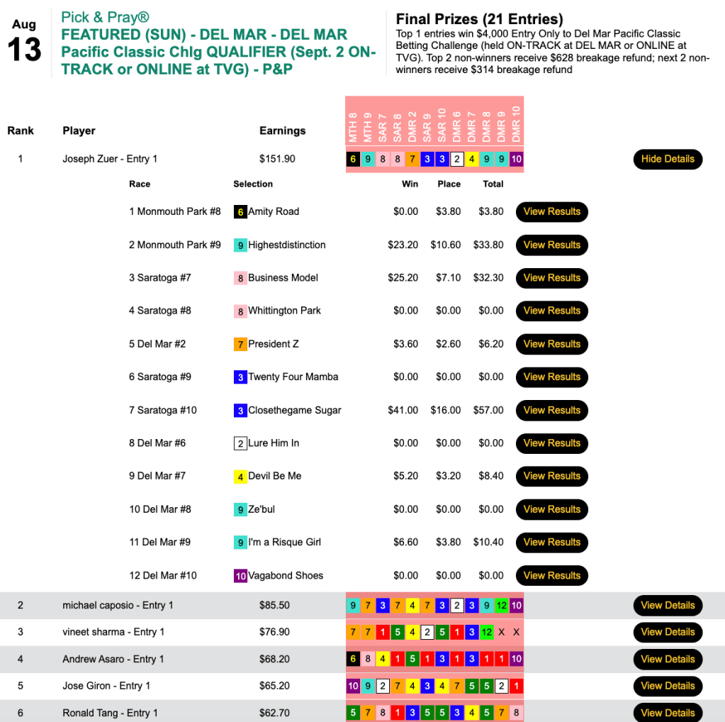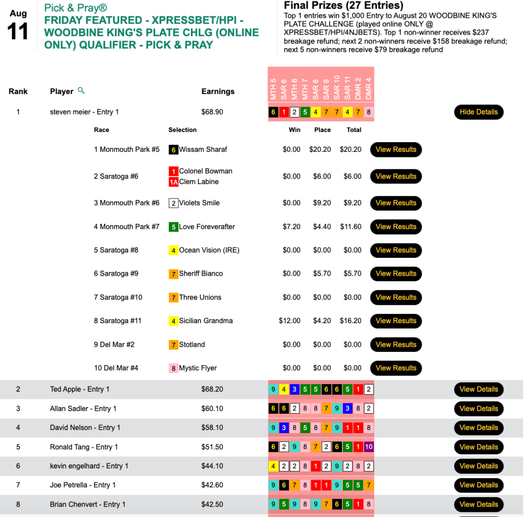 Also the earner of a Woodbine seat on Saturday, Tang picked 4 winners and 1 runner up here in our $10,000 Guaranteed Big Bucks Pick & Pray to pick up the winner’s share of $8,549 in this high-end game that had a final prize pool of $12,213. Tang’s big horse was 13-1 Talent for Gold in race 5 at Del Mar.