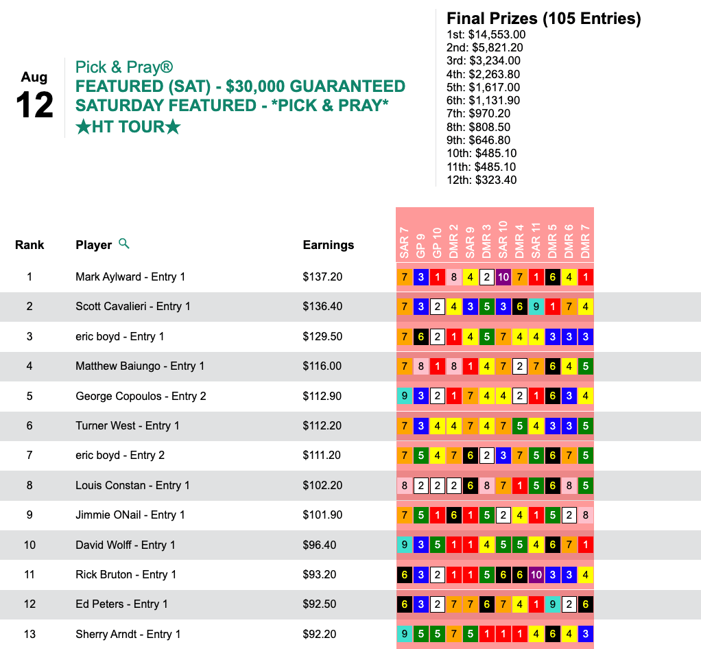 Zuer picked 6 winners, topped by Closethegame Sugar ($41.00, $16.00) in the Mahony Stakes at Saratoga, and added a place collection, to earn $12,600 in Sunday’s HT Tour event, our $20,000 Guaranteed Pick & Pray, which closed with a purse of an even $28,000.