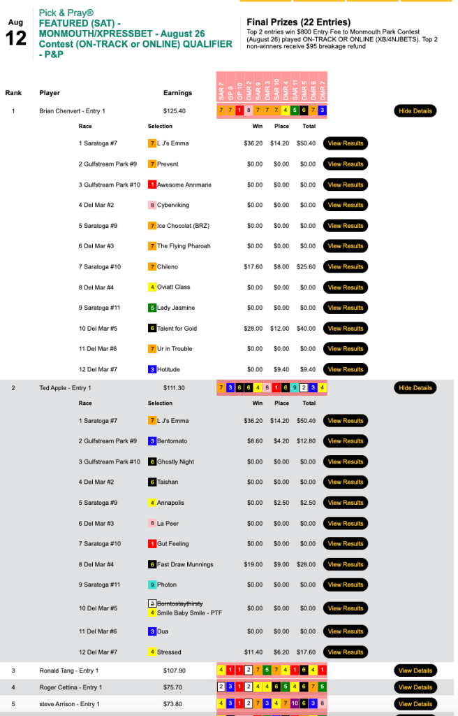 Both Chenvert and fellow $800 seat winner Ted “Forbidden” Apple enjoyed a great start after connecting with L.J.’s Emma in the first contest race, the 7th at Saratoga.