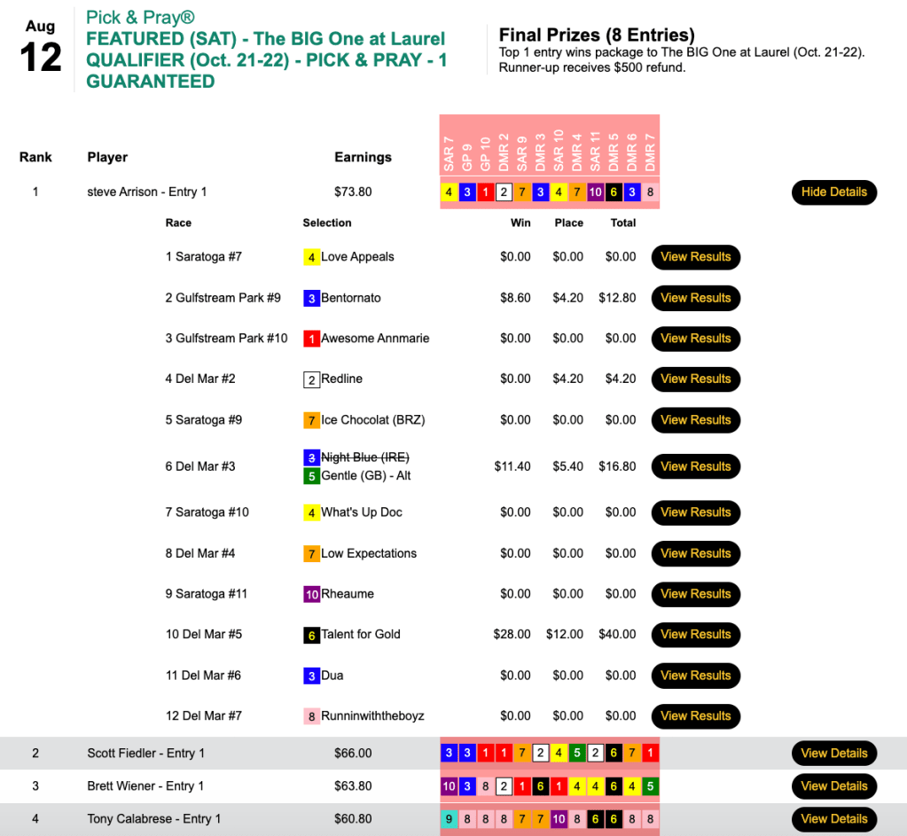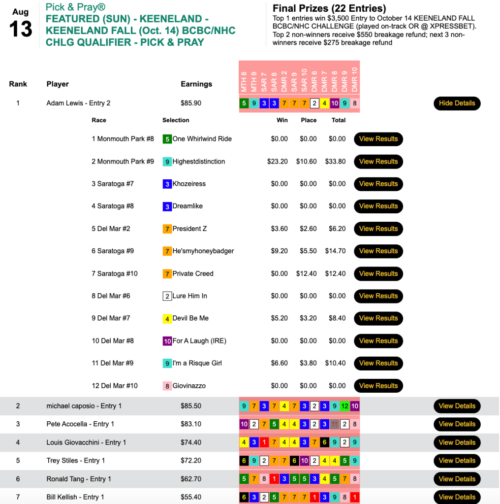 The other Saturday feature at HorsePlayers was a $179 Breeders’ Cup Betting Challenge Pick & Pray.