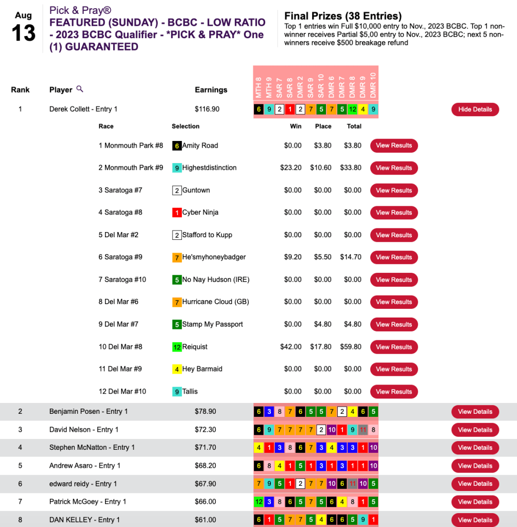 Collets biggest collection among 3 firsts and 2 seconds was with Reiquist ($56.80, $17.80) in race 8 at Del Mar, who got moved up to first via disqualification after finishing second. According to Twitter, the DQ was either a no-brainer or a complete outrage. In any event, Benjamin Posen reported home in second place, and he got a $5,000 partial BCBC entry.