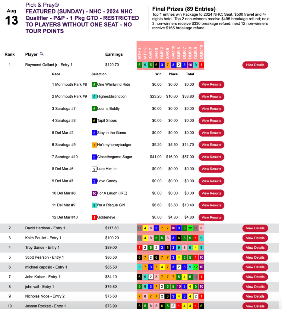 Raymond Gallant Jr. nailed down his spot in Vegas thanks to 4 firsts and 1 second. Earlier in the day, he hit 19-1 Closethegame Sugar at Saratoga, but the seat wasn’t his for sure until he landed a $4.80 place collection in the contest finale, the 10th at Del Mar, to get up for the victory.
