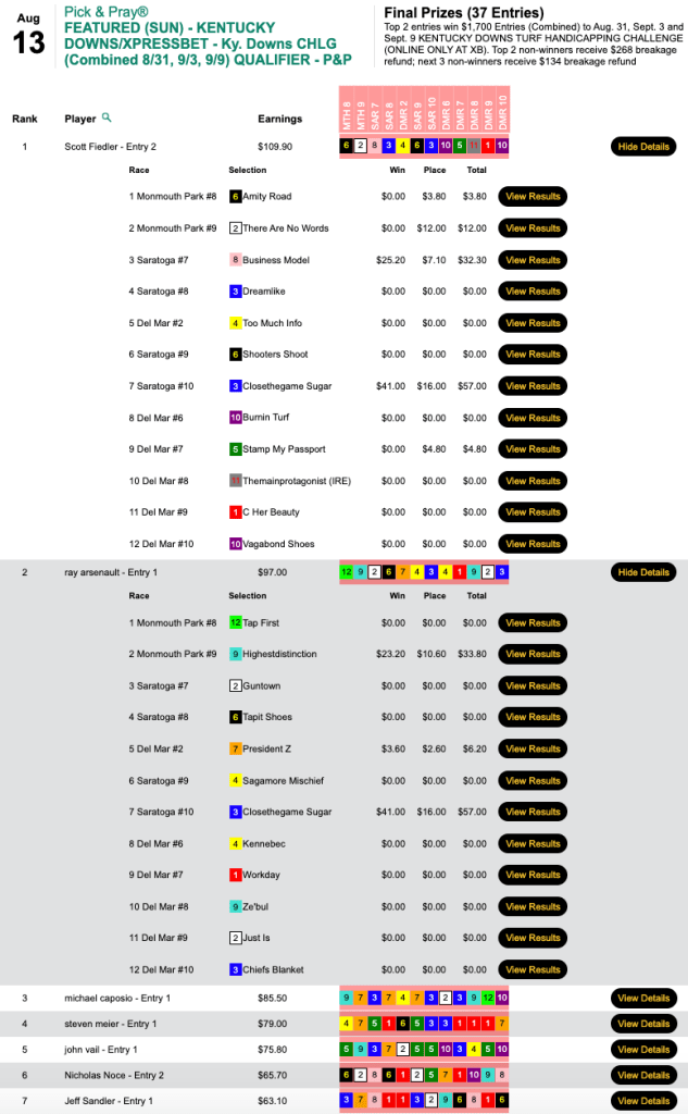 Fiedler and Arsenault were the two recipients of $1,700 in entry fees in Sunday’s play-in to the three-day Kentucky Downs Turf Handicapping Challenge.