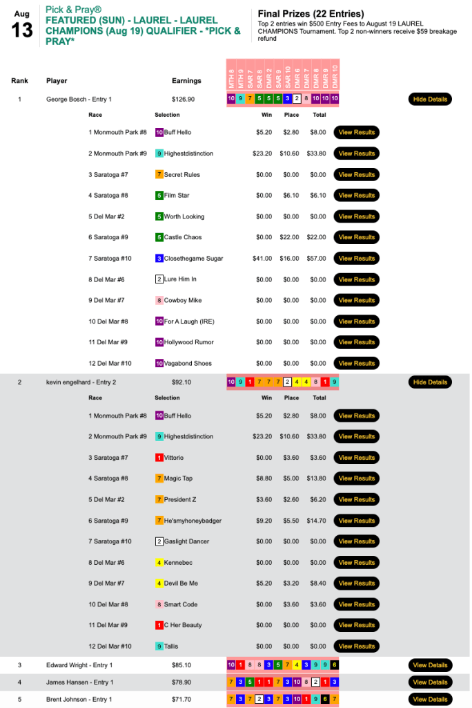 Bosch finished first here with $34.80 to spare. Runner-up Kevin Engelhard (6 wins, 2 places) also got himself a Laurel seat.