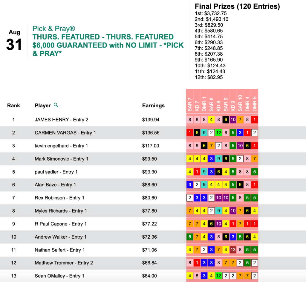 The 2013 Horse Player World Series champ had 44-1 shot More Mango in the 10th at Saratoga among his four Thursday winners (plus a runner up), and that helped propel Henry to a victory worth $3,732 in the day’s $6,000 Guaranteed Pick & Pray, which paid out a total of $8,295.