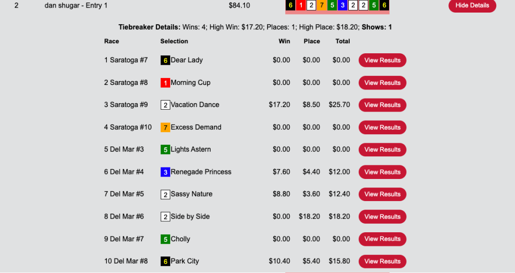 Congratulations to Craig Rowe (4 wins, 2 places) and Pete Acocella (1W, 3P). They each hit Vacation Dance ($17.20, $8.50) in the 9th at Saratoga.