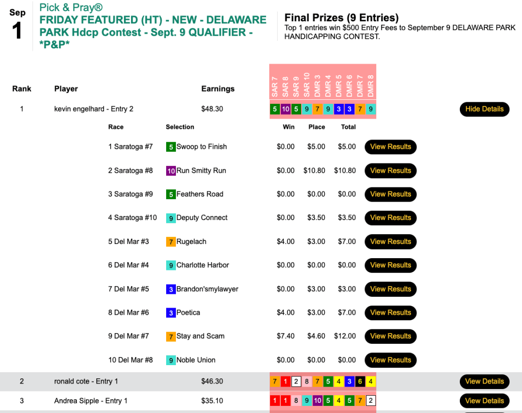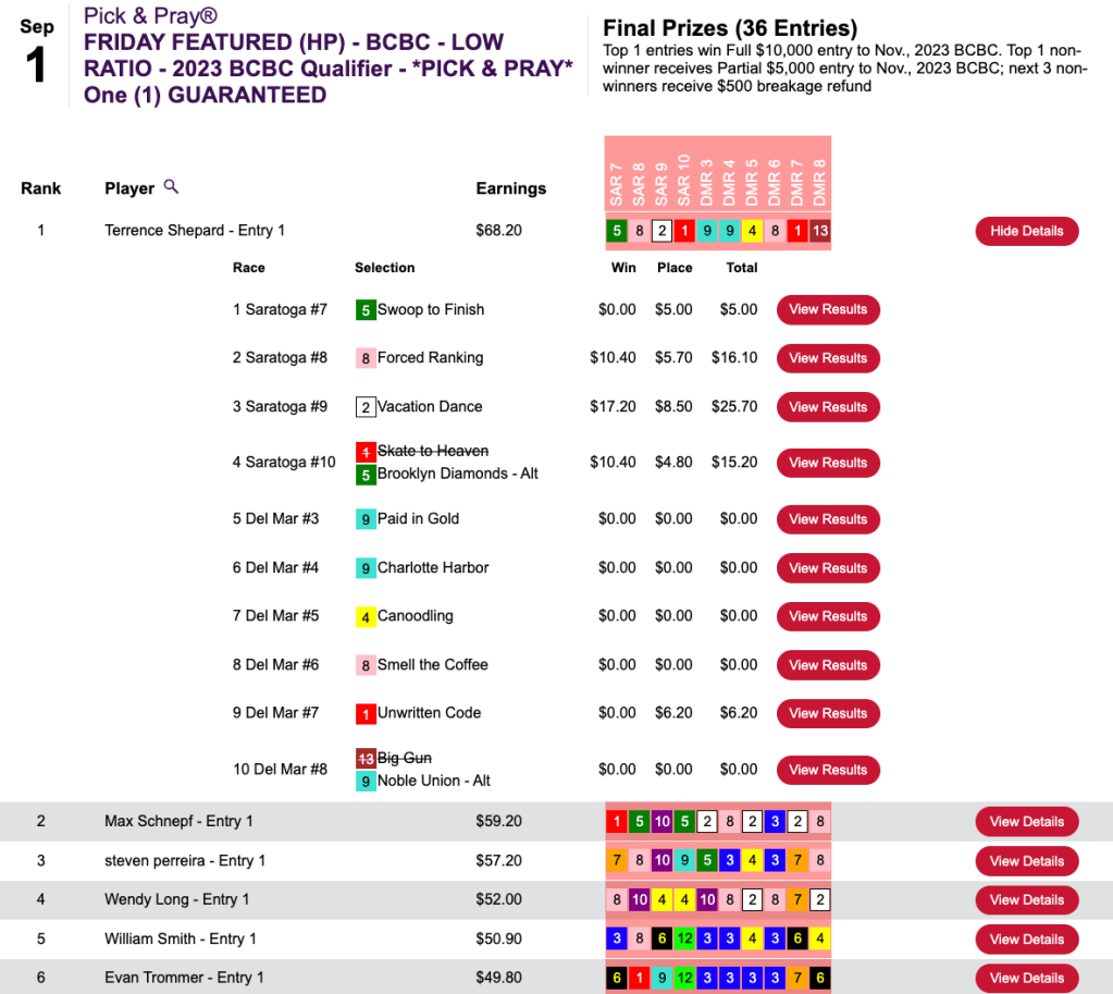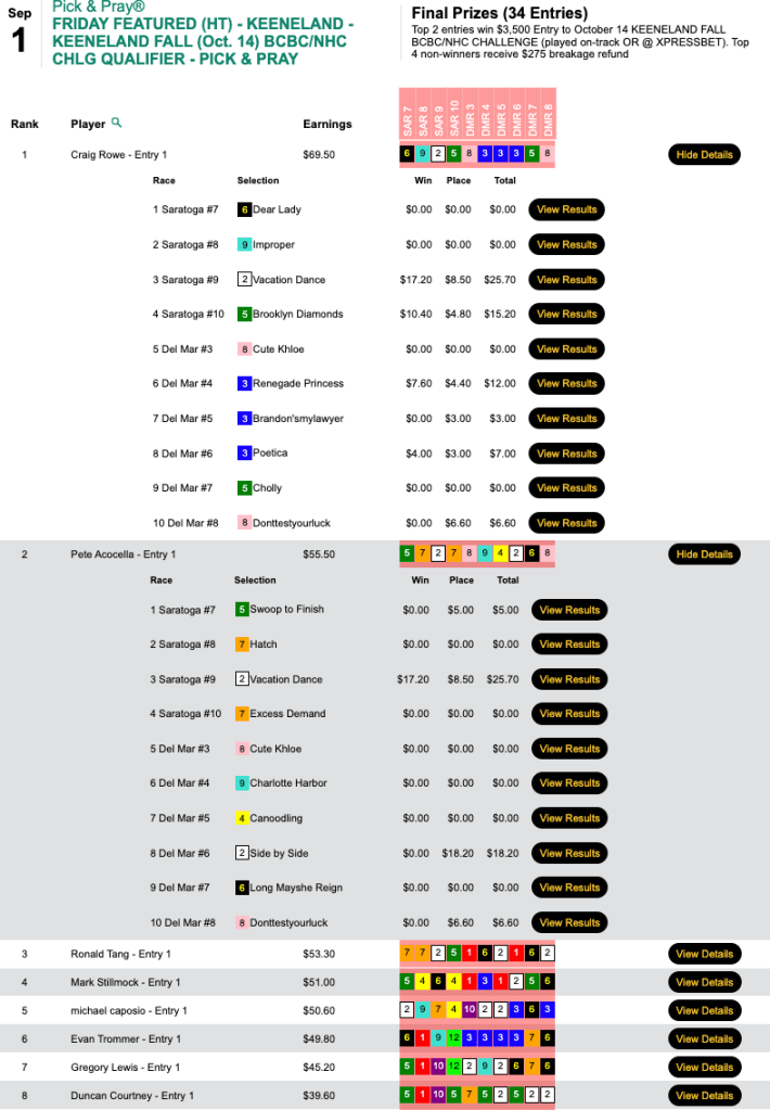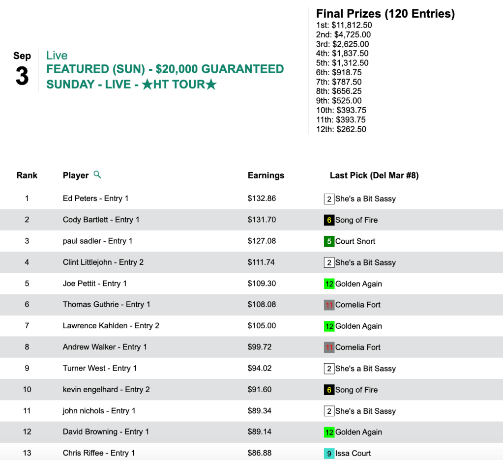 Timothy Jacobs (4 firsts, 3 seconds) picked the winners of the last two races to get up late and take Friday’s HT Tour event, our $15,000 Guaranteed Pick & Pray.