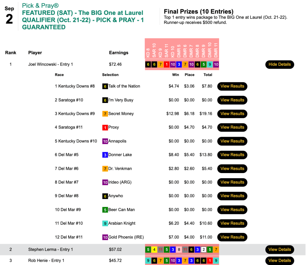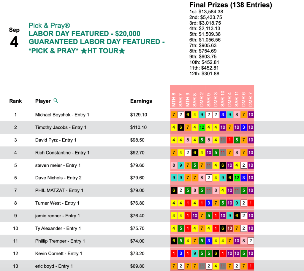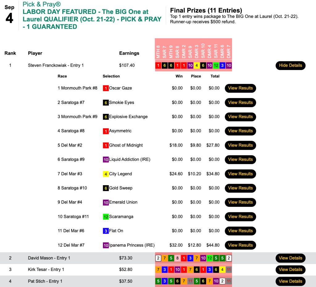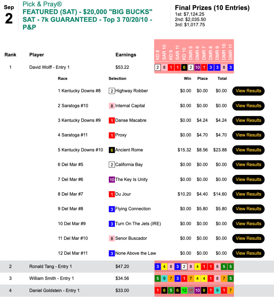On Sunday, August 27, Beychok hit for $11,714 by taking our $20,000 Guaranteed Pick & Pray. On Labor Day, he won another $20,000 Guaranteed Pick & Pray (and HT Tour competition). This one was worth $13,584 to Beychok, who connected with 54-1 Nutella Fella in the Hopeful at the Spa and with Ipanema Princess at Del Mar at the end.