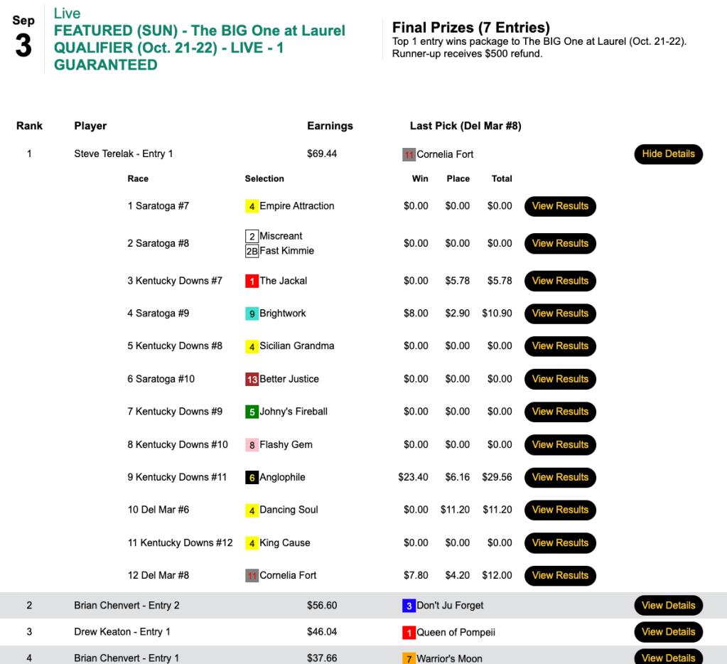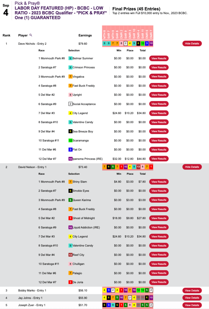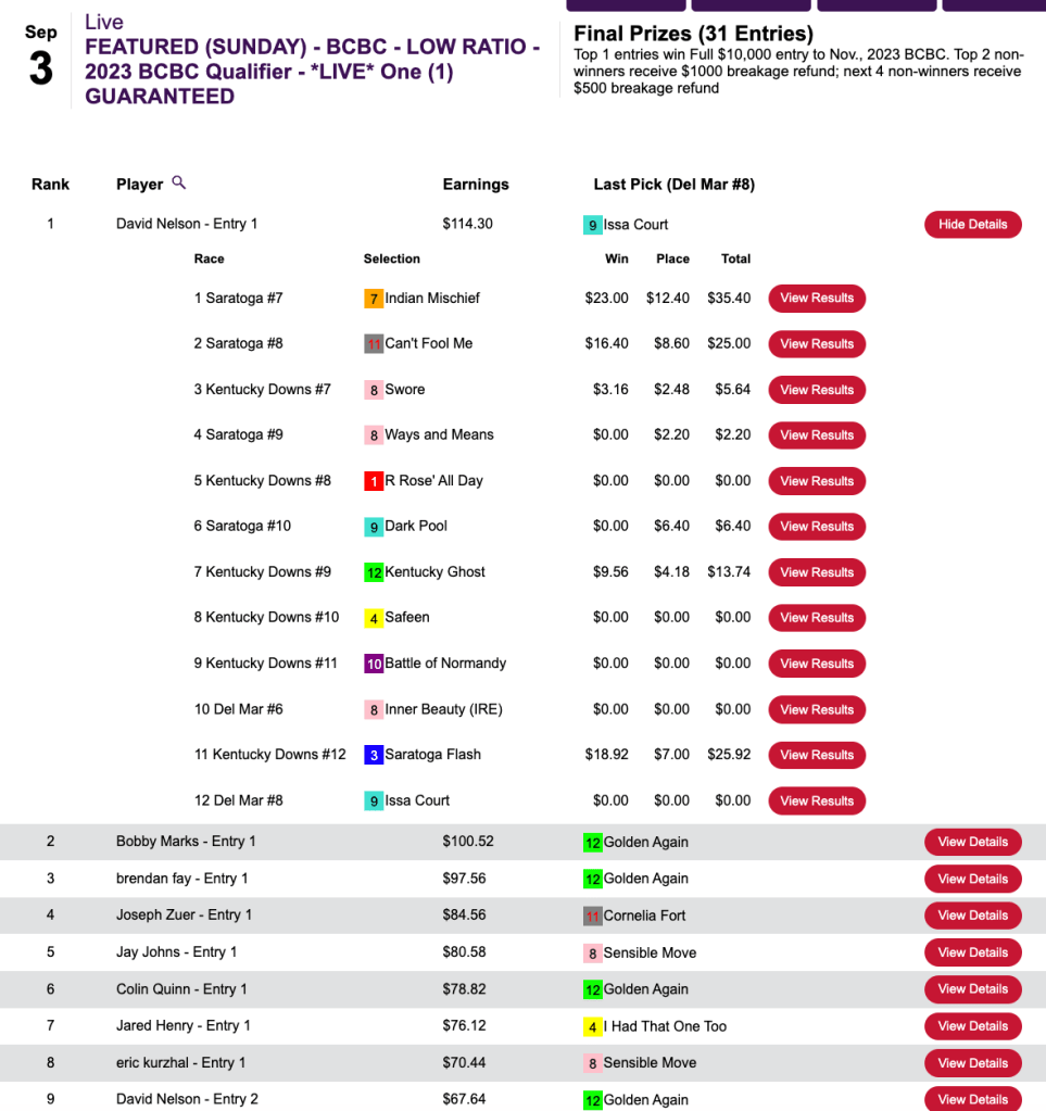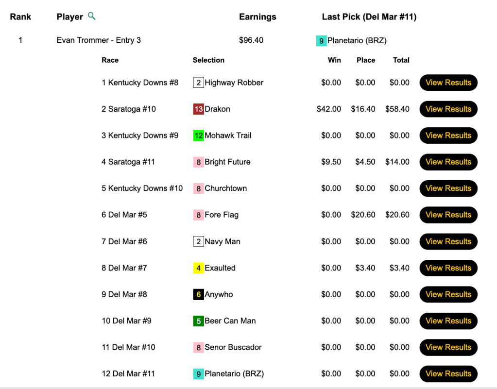 On Sunday, August 27, Beychok hit for $11,714 by taking our $20,000 Guaranteed Pick & Pray. On Labor Day, he won another $20,000 Guaranteed Pick & Pray (and HT Tour competition). This one was worth $13,584 to Beychok, who connected with 54-1 Nutella Fella in the Hopeful at the Spa and with Ipanema Princess at Del Mar at the end.