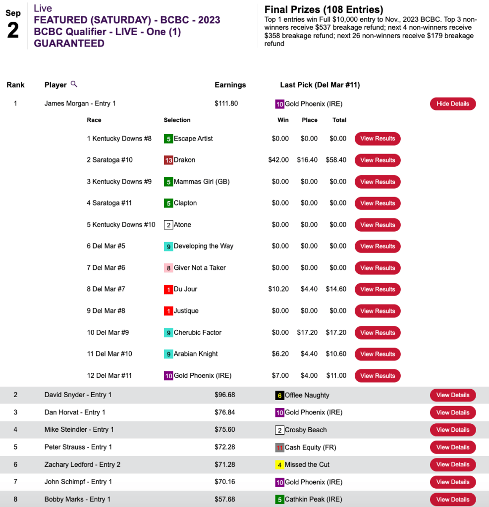 Morgan had 4 winners (including Drakon) and a double-digit place horse to walk off with the $10,000 seat in Saturday’s $179 Breeders’ Cup Betting Challenge at HorsePlayers.
