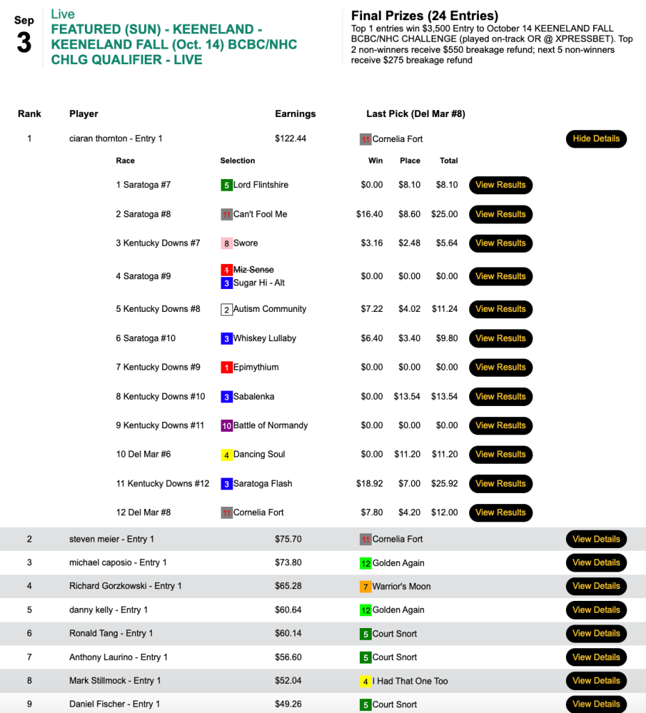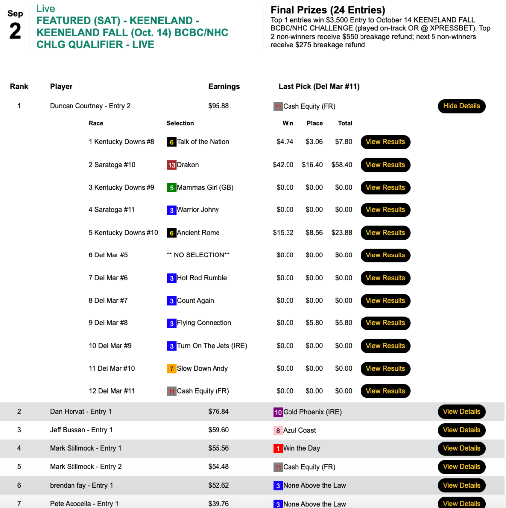 Duncan Courtney failed to enter a selection in one of Saturday’s 12 contest races, but that didn’t keep him out of the winner’s circle in our Keeneland Fall BCBC/NHC Challenge qualifier.