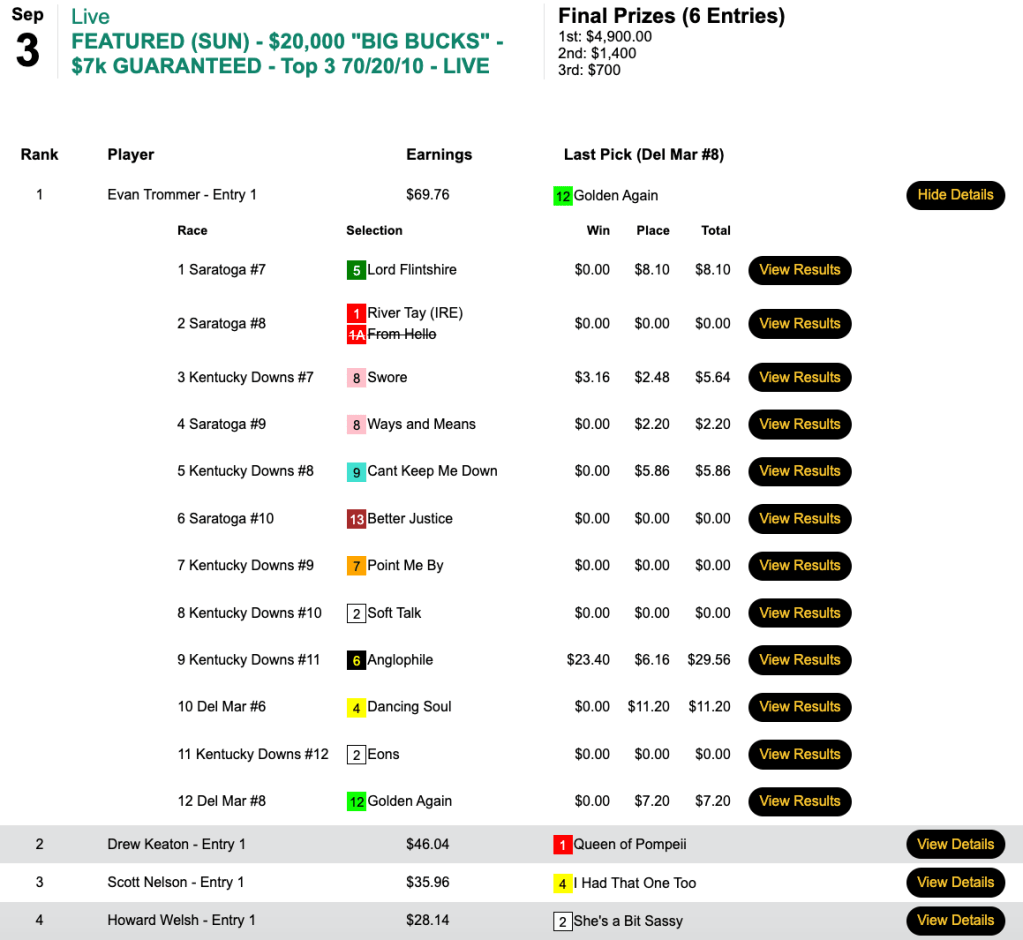 The Floridian had Anglophile ($23.40, $6.16) in the 11th at Kentucky Downs among his 2 firsts and 5 seconds, and his final total of $69.76 was good for a $4,900 payday in Sunday’s $7,000 Guaranteed Big Bucks tourney, which went off at a 1.4% overlay to players.