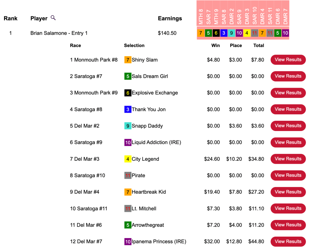 Brian Salomone’s total of $140.50 (built on 6 wins and 1 place) was the high-water mark of the day. He led the way in a competition that also saw “The Commissioner” Tim Smith (3W, 0P), Mike Steindler (3W, 1P, despite whiffing on the first 7 races), David Browning (3W, 2P) and Mark “Doctor” Detro (3W, 3P) punch their tickets to Vegas. All five nailed Ipanema Princess ($32.00, $12.80) in the final contest race, the 7th at Del Mar.