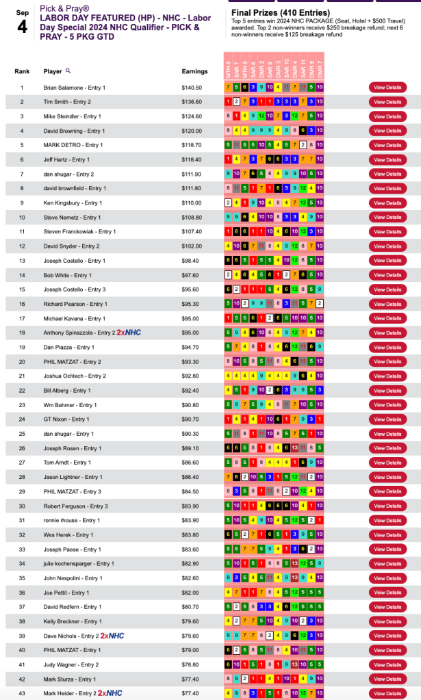 The big event on Labor Day was a special $125 NHC qualifier at HorsePlayers that guaranteed 5 seats.