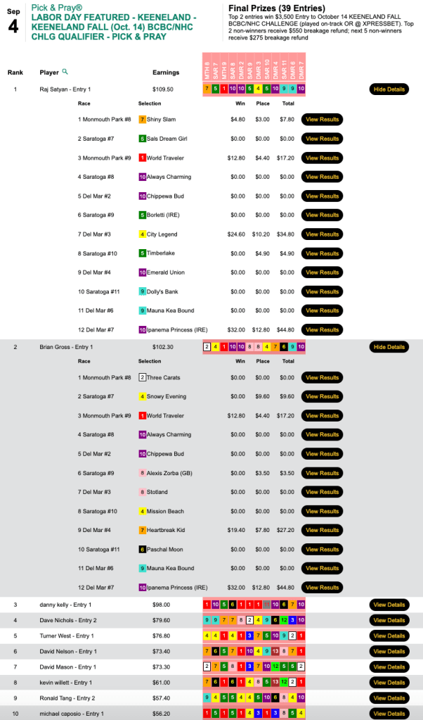 Raj Satyan (4 wins, 1 place) and Brian “Totally” Gross (3W, 2P) were the two players to crack triple digits in Monday’s Keeneland Fall BCBC/NHC Challenge play-in.