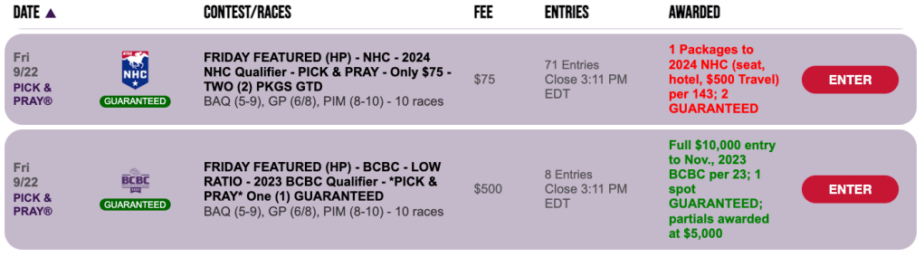 The Sunday opportunity to qualify for the 2024 NHC is here at HorseTourneys on Sunday. It’s a “regular,” $165 Pick & Pray with two seats guaranteed. The winning ratio is 1-per-65.