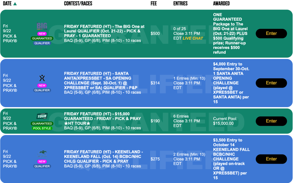 You already know three of them—qualifiers to The BIG One, the Santa Anita Opening Weekend Challenge and the Keeneland Fall BCBC/NHC Challenge. All three are Pick & Prays…and note that the qualifier for The BIG One guarantees TWO spots to the October 21-22 competition (rather than the one spot guaranteed on Friday and Saturday.