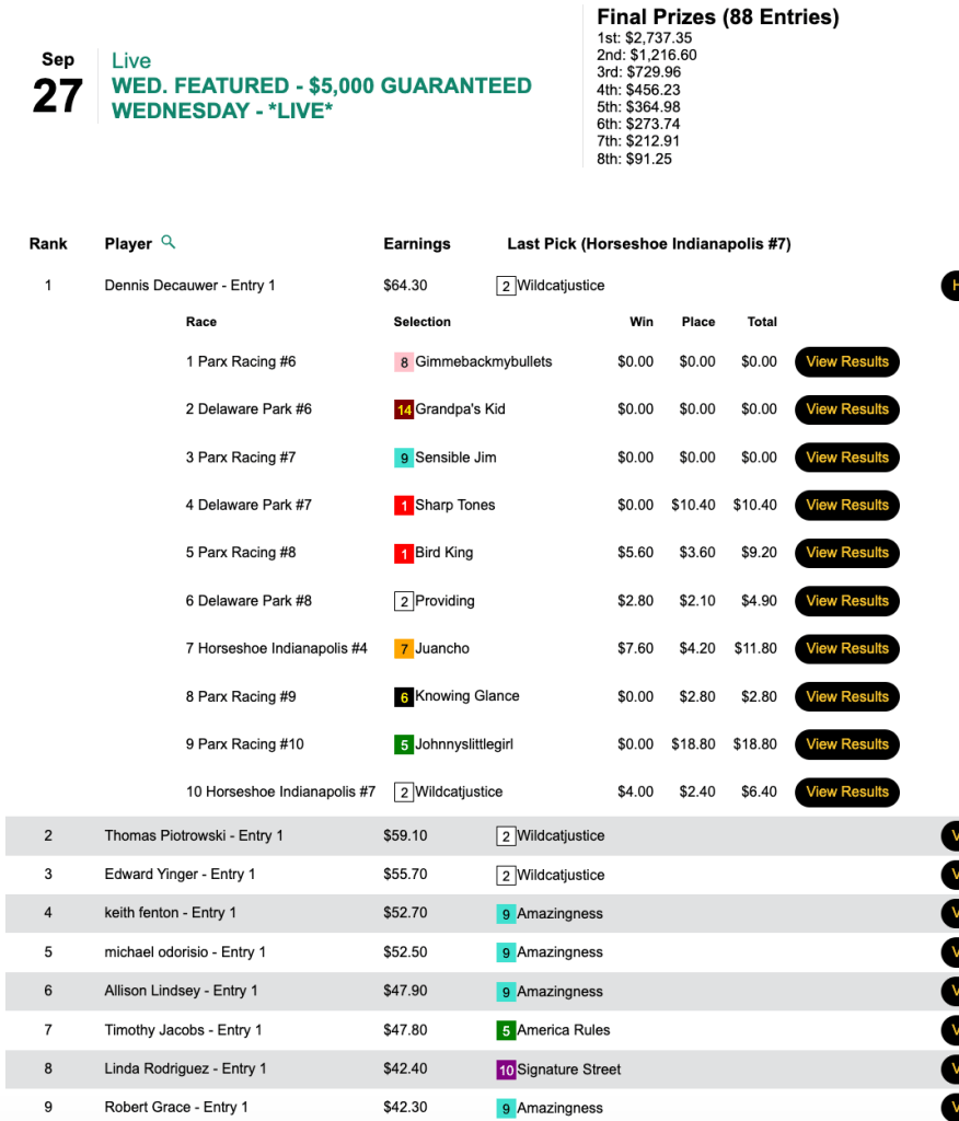 Dennis Decauwer (4 wins, 3 places) dwelt a bit at the start, but he more than made up for that by making collections in each of the final seven contest races to take Wednesday’s $5,000 Guaranteed cash tourney. Decauwer, whose best return came via an $18.80 place payoff in the next-to-last race, earned $2,783 of the final overall purse of $6,083.
