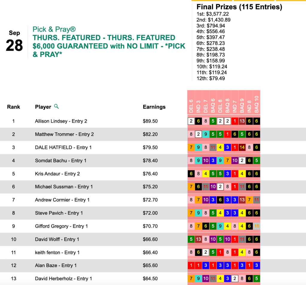 …and she collected $3,577 in Thursday’s $6,000 Gtd. Pick & Pray, which closed its doors with a total of $7,949 in the kitty.