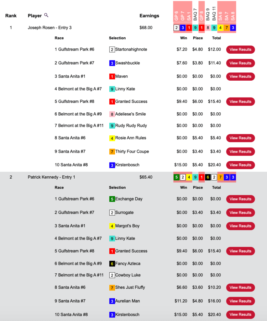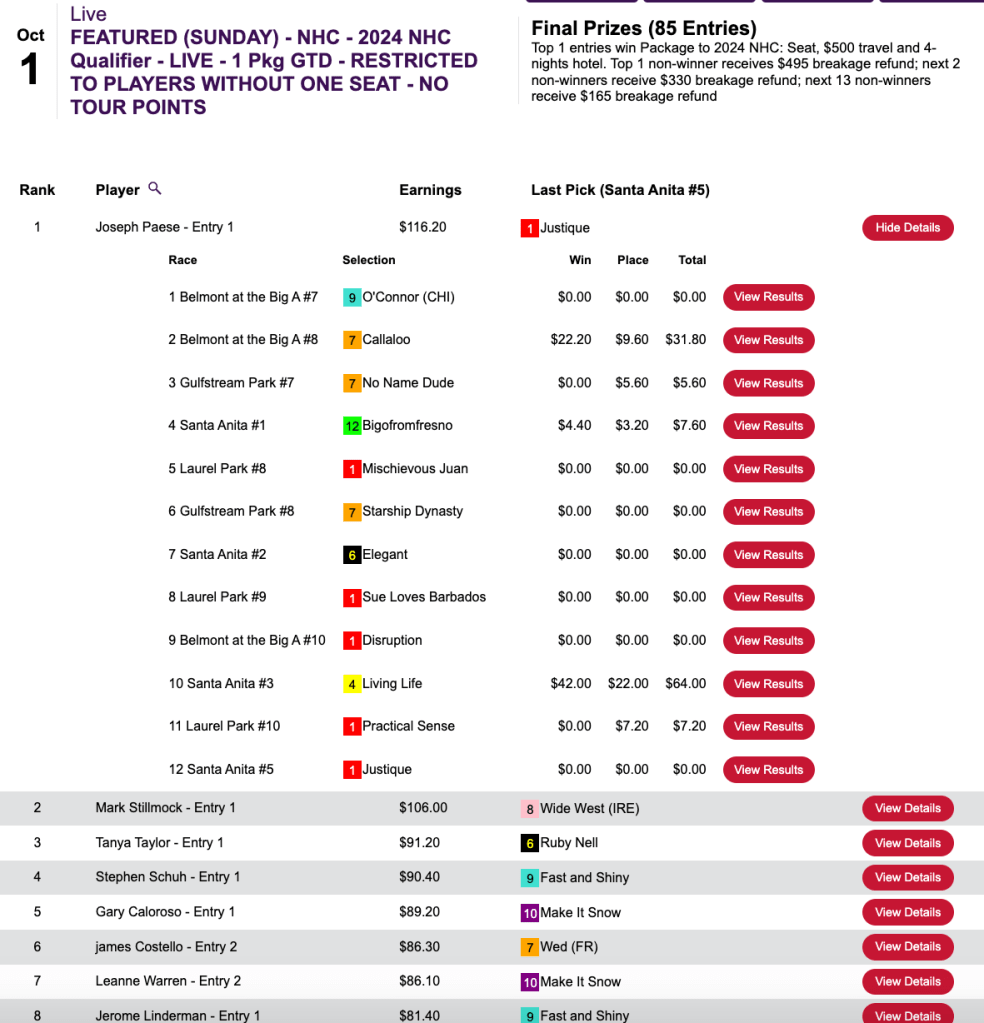 At HorsePlayers, the two seat winners in the day’s $75 NHC play-in were Joseph Rosen (4 wins, 2 places) and Patrick Kennedy (4W, 1P).