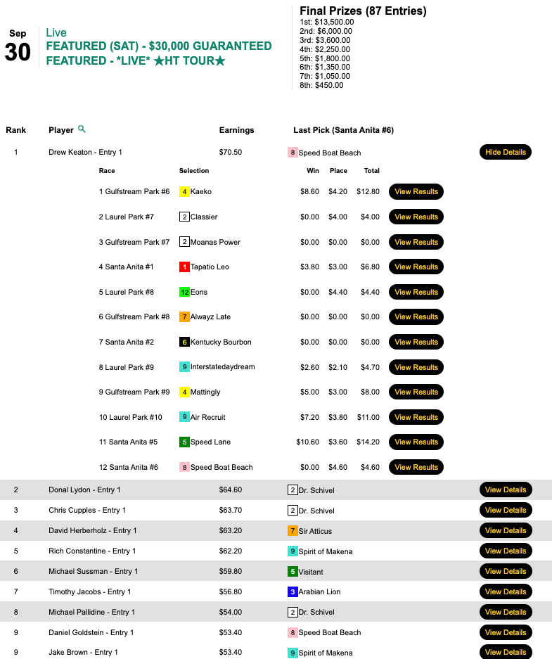 Keaton continued his recent hot streak by compiling 6 firsts and 3 seconds…including a run of 4 straight winners at one point. The nine collections got him the grand prize of $13,500 in Saturday’s HT Tour battle, our $30,000 Gtd. tourney, which went off with a takeout to players of 1.4%.
