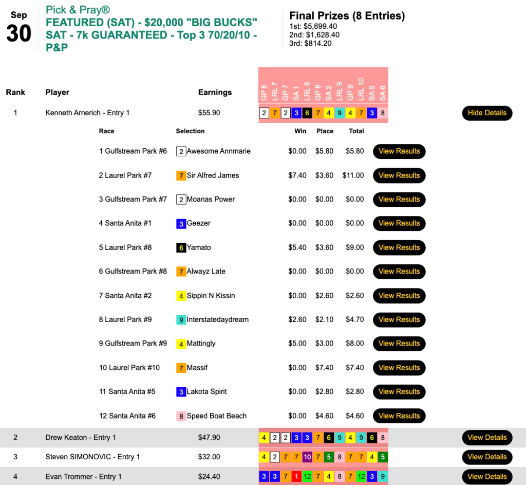 Of course, lucrative is as lucrative does. Arnerich finished with 4 winners and 5 runners up, and he took home the up-top money of $5,699 in Saturday’s $7,000 Gtd. Big Bucks Pick & Pray, which finished up with a pot of $8,142.