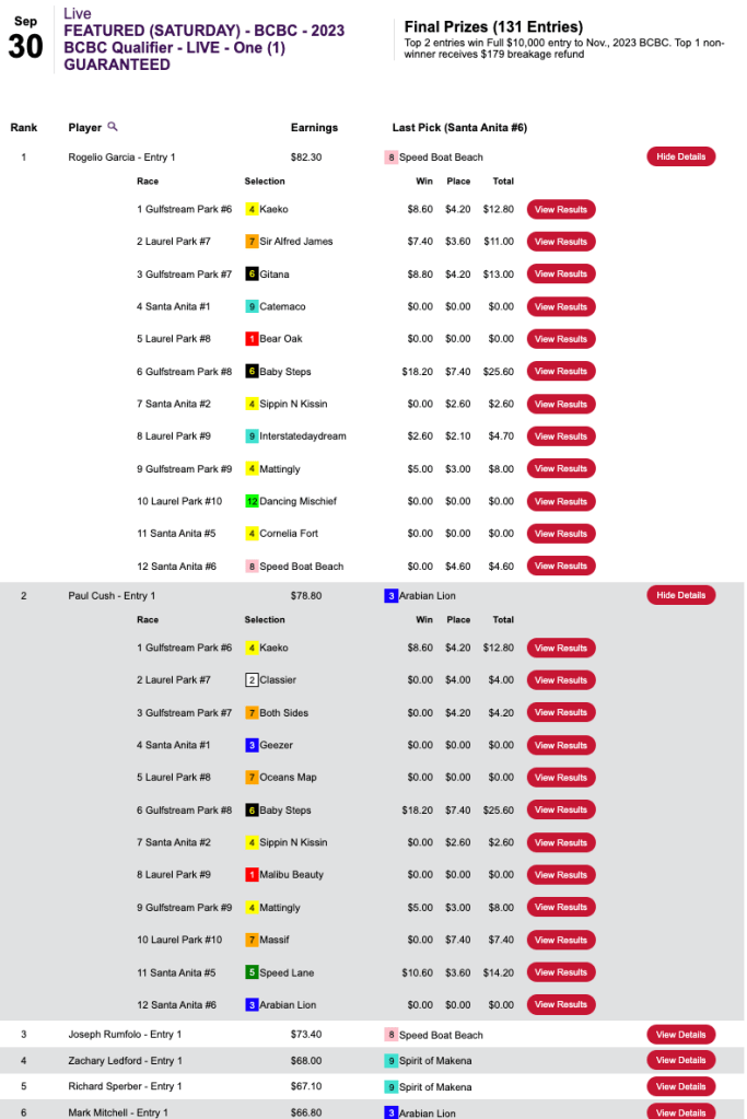 It turned out there were enough entries signed on to distribute two seats, and those went to Rogelio Garcia (6 wins, 2 places) and Paul Cush (4W, 4P). Baby Steps was the greatest common denominator of their scorecards.