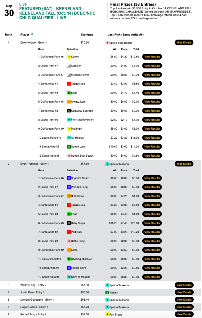 The same picks on Saturday brought Keaton a $3,500 Keeneland Fall BCBC/NHC Challenge entry.