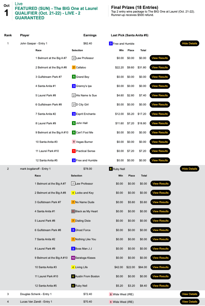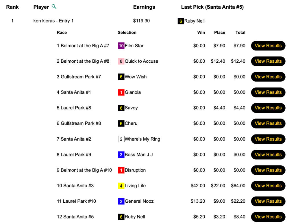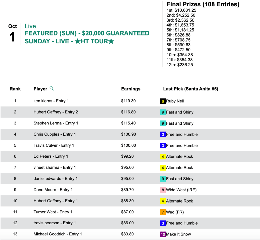 Kieras (3 wins, 3 places) was loving life after Living Life took the 3rd at Santa Anita at 87-1. He added two more winners thereafter, though, to get where he wanted to be. Kieras pocketed $10,631 for capturing Sunday’s HT Tour matchup, our $20,000 Guaranteed tourney. The final prize pool for this one came out to $23,625.