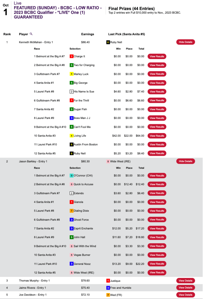 For the second straight day, the BCBC qualifier paid out two seats rather than the guaranteed one seat. Kenny “Living Life” McMahan got the top spot with 3 wins and 1 place. Jason Barkley earned the other available $10,000 entry on the strength of 4 firsts and 2 seconds. Barkley’s biggest return came with a $13.20 winner.