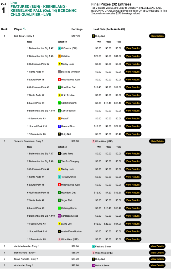 Not only did Tesar win again (this time in Sunday’s Keeneland Fall BDBD/NHC Challenge qualifier), but he did so by again hitting the final two contest races. This time, his closest pursuer at the finish was Terrence Severson (2W, 1P). Severson also received a $3,500 Keeneland entry for his efforts.
