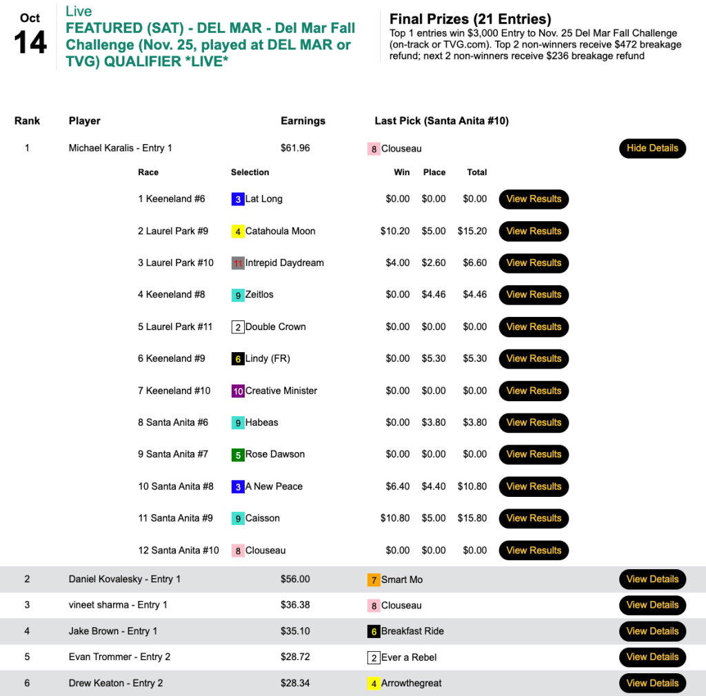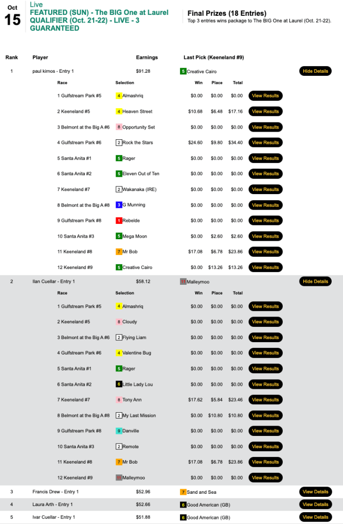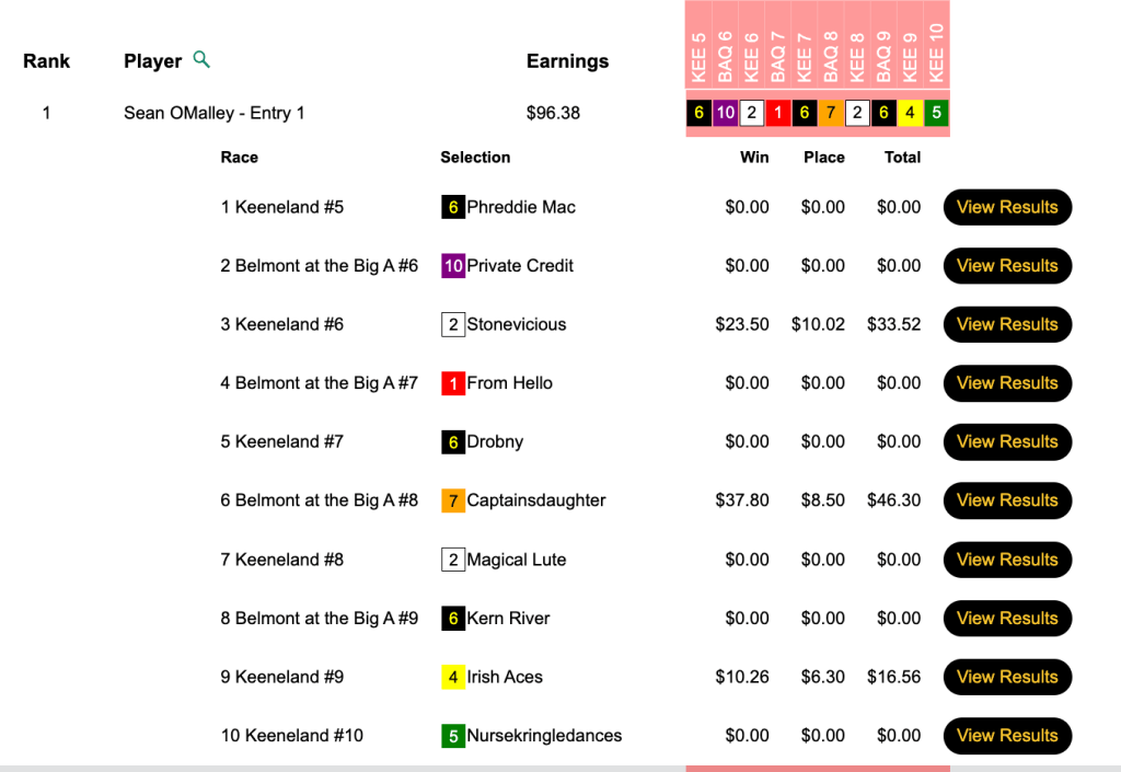 Rock the Starts did much of the heavy lifting for Paul Kimos (3 wins, 1 place) on his way to first place. Ilan Cuellar (2W, 1P) whiffed on the first six contest races, but he landed on a couple of winners in the second half that each paid 17 dollars and change. Francis Drew (2W, 3P) got the final berth. His top winner paid $10.68 to win.