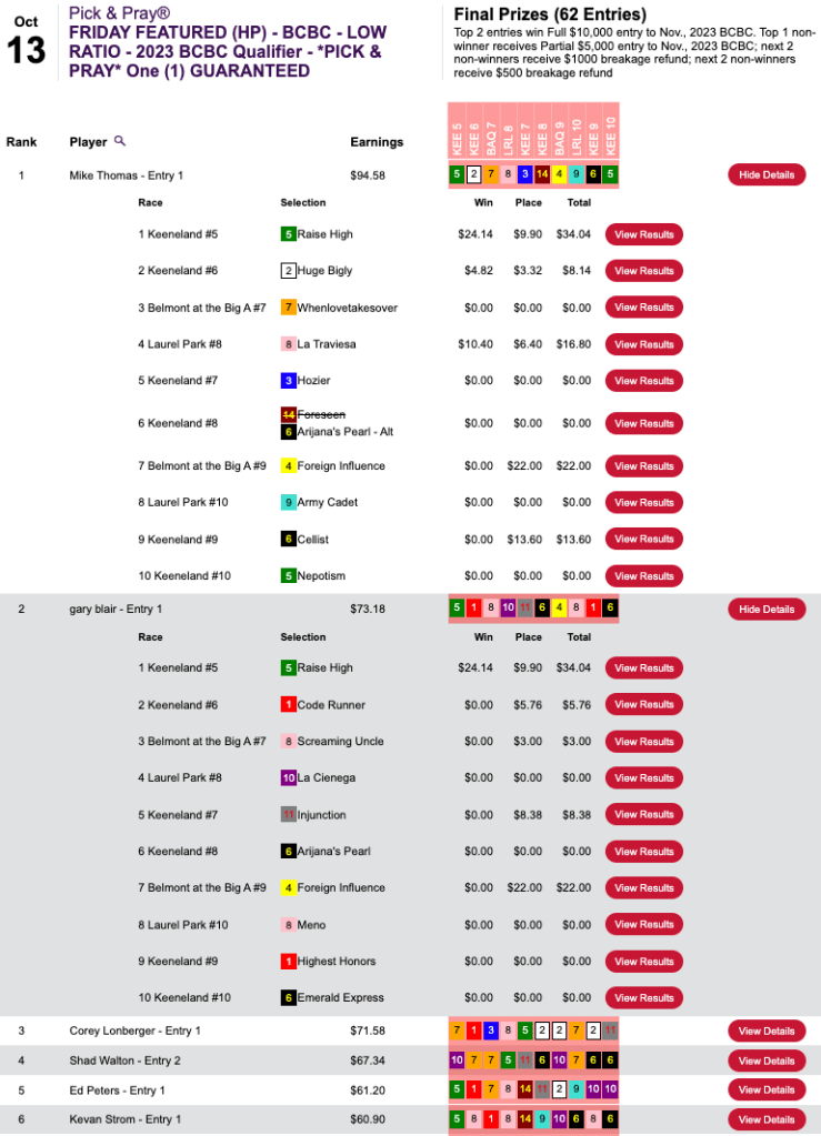 Congratulations to Mike Thomas (3 wins, 2 places) and Gary Blair (1W, 4P). The best winner for both—and, in fact, the only winner for Blair—was Raise High ($24.14., $9.90) in the first contest race, the 5th at Keeneland. Kudos also go out to 3rd-place finisher Corey Lonberger, who picked up a $5,000 partial entry for completing the trifecta.