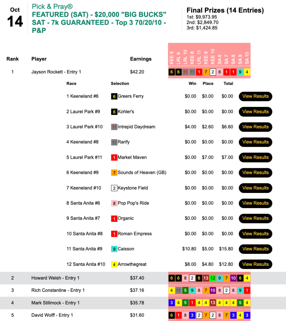 Rockett connected on 4-1 and 3-1 winners at the end to finish with 3 wins and 1 place, and a score of $42.20. That wasn’t enough to achieve a “flat-bet profit,” but you don’t always need those to capture our Big Bucks tourneys, and that’s what Rockett did. He kicked away from the field by $4.80 at the end and earned the top prize of $9,973, which was 70% of the total final purse of $14,248.