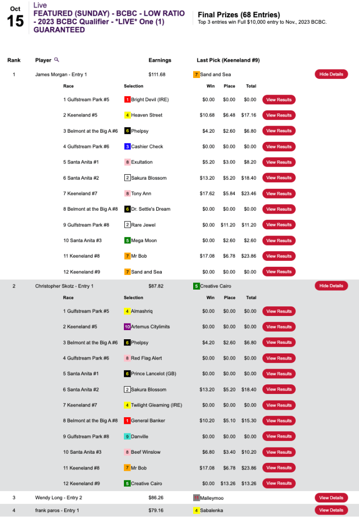 Then again, interest in BCBC qualifiers has really intensified lately with the big live-bankroll contest just a few weeks away. There were 68 entrants in this HorsePlayers competition, and the winner was James Morgan, who put together 6 wins and 2 places. Sixty-eight entries meant that three $10,000 seats could be distributed and the other two went to Christopher “Mary Queen of” Skotz (5W, 1P) and Wendy Long (4W, 2P).