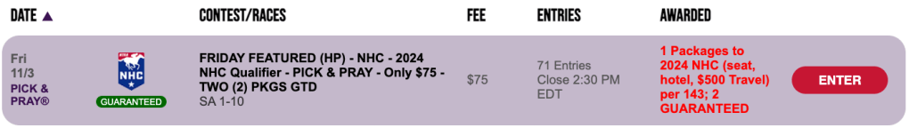 The other Friday feature is over at HorsePlayers. It’s a $75 NHC Pick & Pray with two March 2024 spots guaranteed. The winning ratio is 1-per-143.