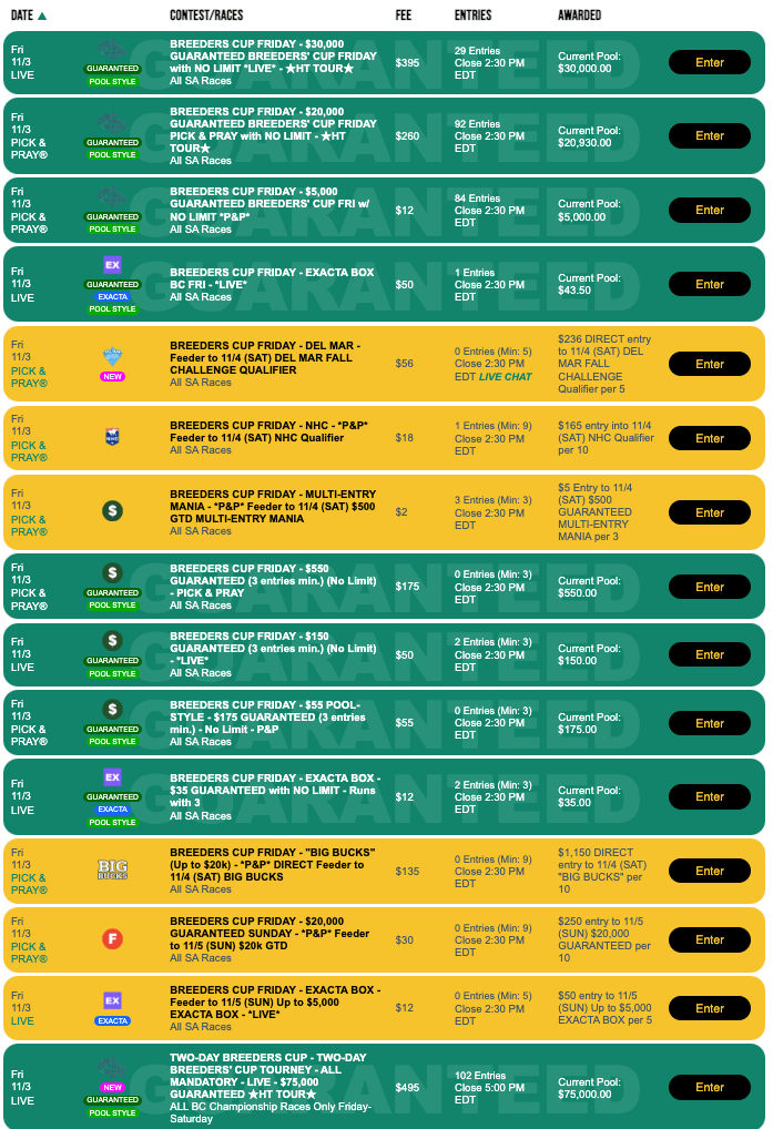 I’ve said it before in this space, and I’ll say it again. There’s a lot of hoopla attached to Breeders’ Cup weekend—and with good reason. However, if you’re looking for an edge, the best day of the weekend to play here might be Sunday. Many of our players will have a “Breeders’ Cup hangover.” Others will be traveling home from having attended the Breeders’ Cup. It’s a good day to try and catch the competition napping (in some cases, literally)…or to pounce on guaranteed games that may not reach their guarantee.