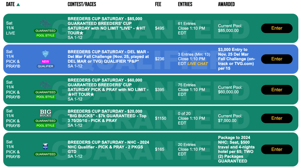 The other Saturday play-in is that for the November 25th Del Mar Fall Handicapping Challenge (playable on-track or at TVG.com). One of every 15 entrants, at $236 per entry, will earn a $3,000 “DMFC” seat in this Pick & Pray.