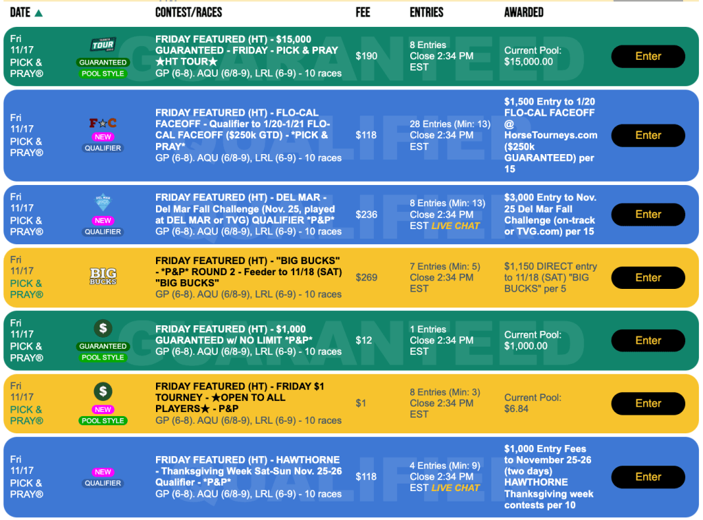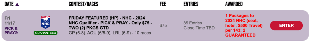 The Friday qualifier for the November 25th Del Mar Fall Handicapping Challenge is a $236, 1-per-15 Pick & Pray. Winner(s) earn a $3,000 entry.