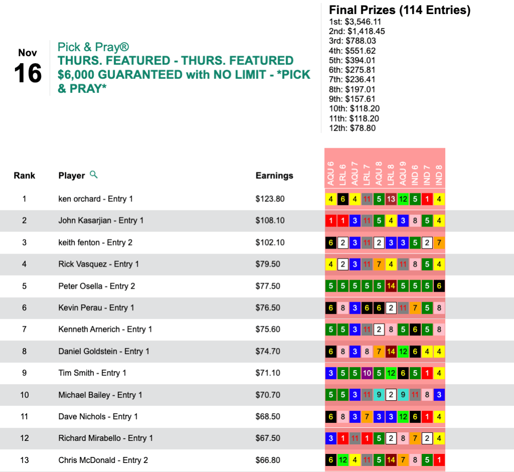 Friday’s highest scorer was Robert Ferguson. He won his NHC seat at HorsePlayers the old fashioned way—by picking winner after winner.