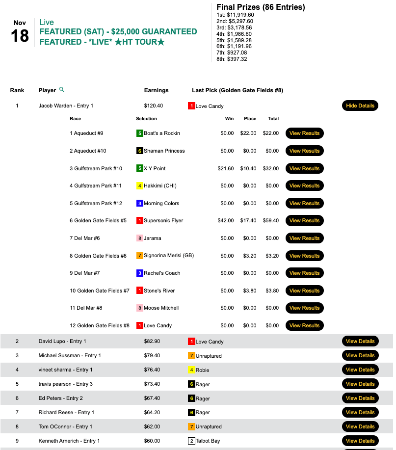 Jacob Warden got the $11,919 grand prize here thanks to 2 winners and 3 runners up. His two winners were the day’s biggest prices—X Y Point ($21.60, $10.40) in the 10th at Gulfstream and Supersonic Flyer ($60.60, $17.40) in race 5 at Golden Gate.