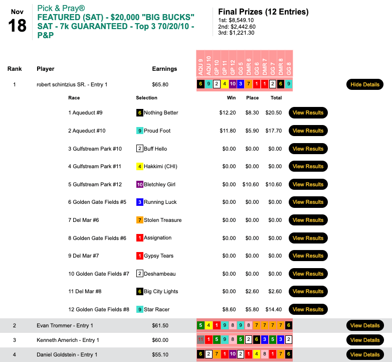 In Saturday’s Pick & Pray, which closed with a pot of $12,213, Schintzius had Star Racer ($8.60, $5.80) in the final contest race (the 8th at Golden Gate) to jump from 4th all the way to 1st.