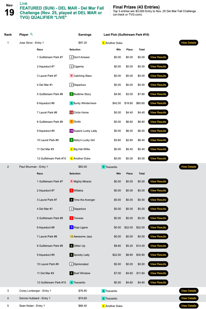 Giron took a backseat to no one in Sunday’s Del Mar Fall Handicapping Challenge play-in. His 3 wins and 4 places included 21-1 Bunty Windemere in race 8 at the Big A. Occupying the second and third positions on the leaderboard were NHC Hall of Famer Paul Shurman (3W, 2P) and Corey Lonberger (3W, 2P) and they, too, earned $3,000 seats for this coming Saturday.