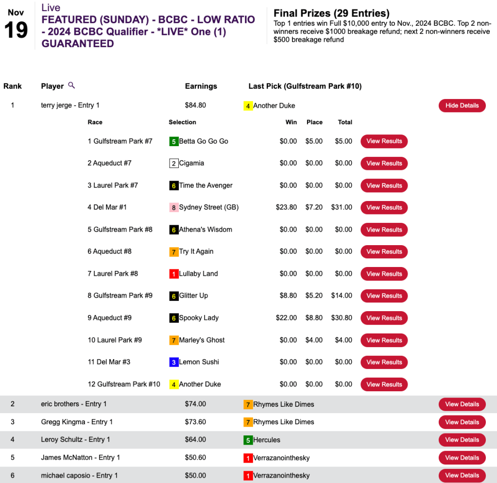 Sydney Street was the star among the 3 firsts and 2 seconds that earned Jerge a $10,000 Breeders’ Cup Betting Challenge in Sunday’s Low Ratio qualifier at HorsePlayers.