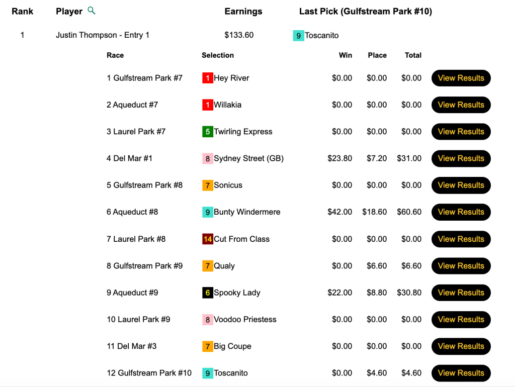 With 2 winners and 3 runners up on Friday, “Little Bucks” Welsh reminded us that he is plenty capable of winning games that don’t carry a four-figure entry fee too. Thanks in large part to Lady Milagro ($104.50, $23.00) in race 8 at Aqueduct, Welsh earned $7,630 in Friday’s HT Tour event, our $15,000 Gtd. Pick & Pray, which had a final overall purse of $16,958.