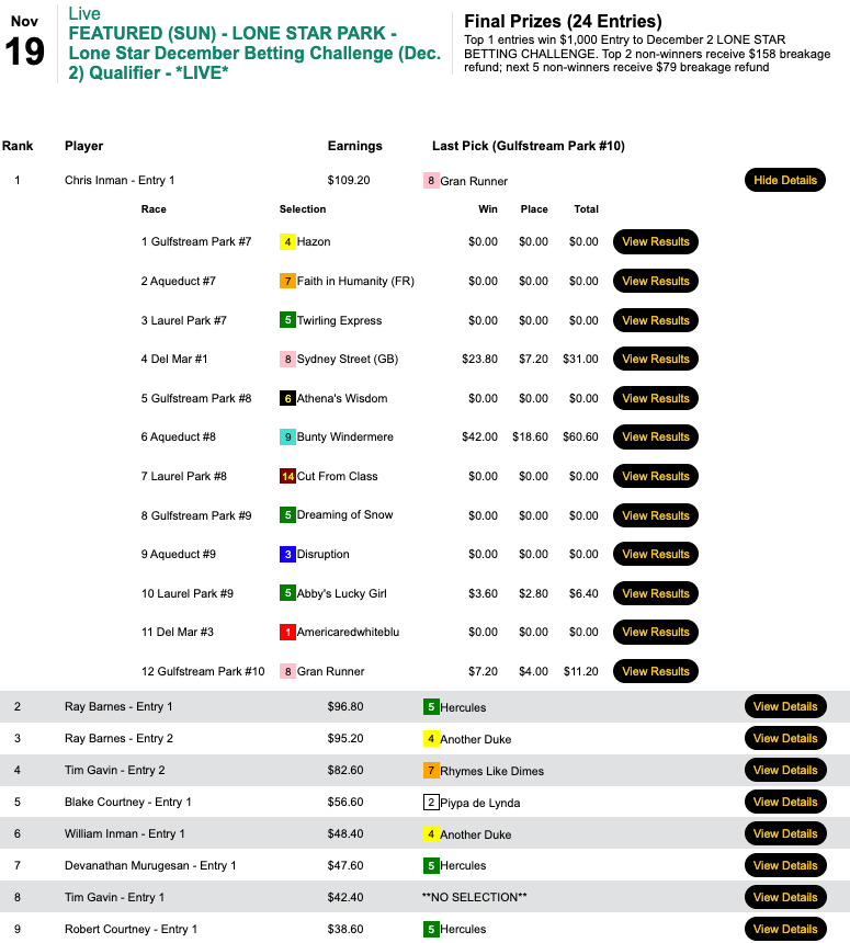 Courtney finished first in the Saturday qualifier to the Fall Simulcast Challenge at Lone Star Park. He will be joined there on December 2 by runner up Tim Gavin (4W, 4P).